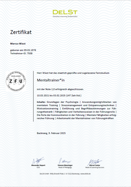 Mentaltrainer für Führungskräfte (staatlich anerkannt) DeLSt
